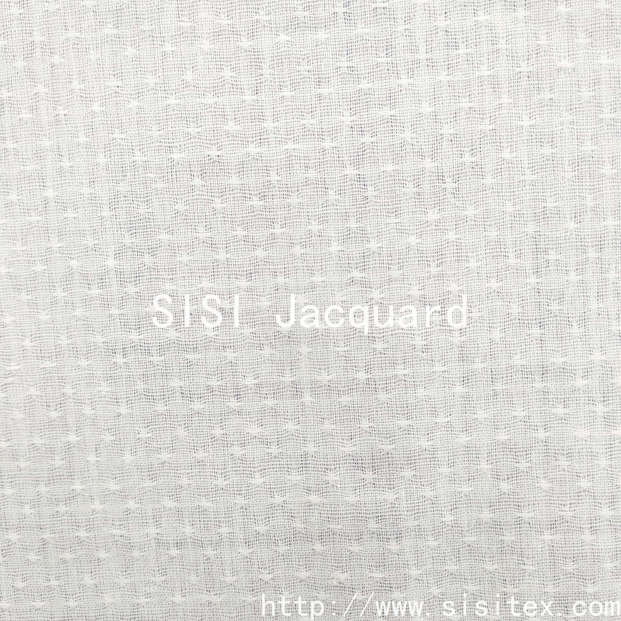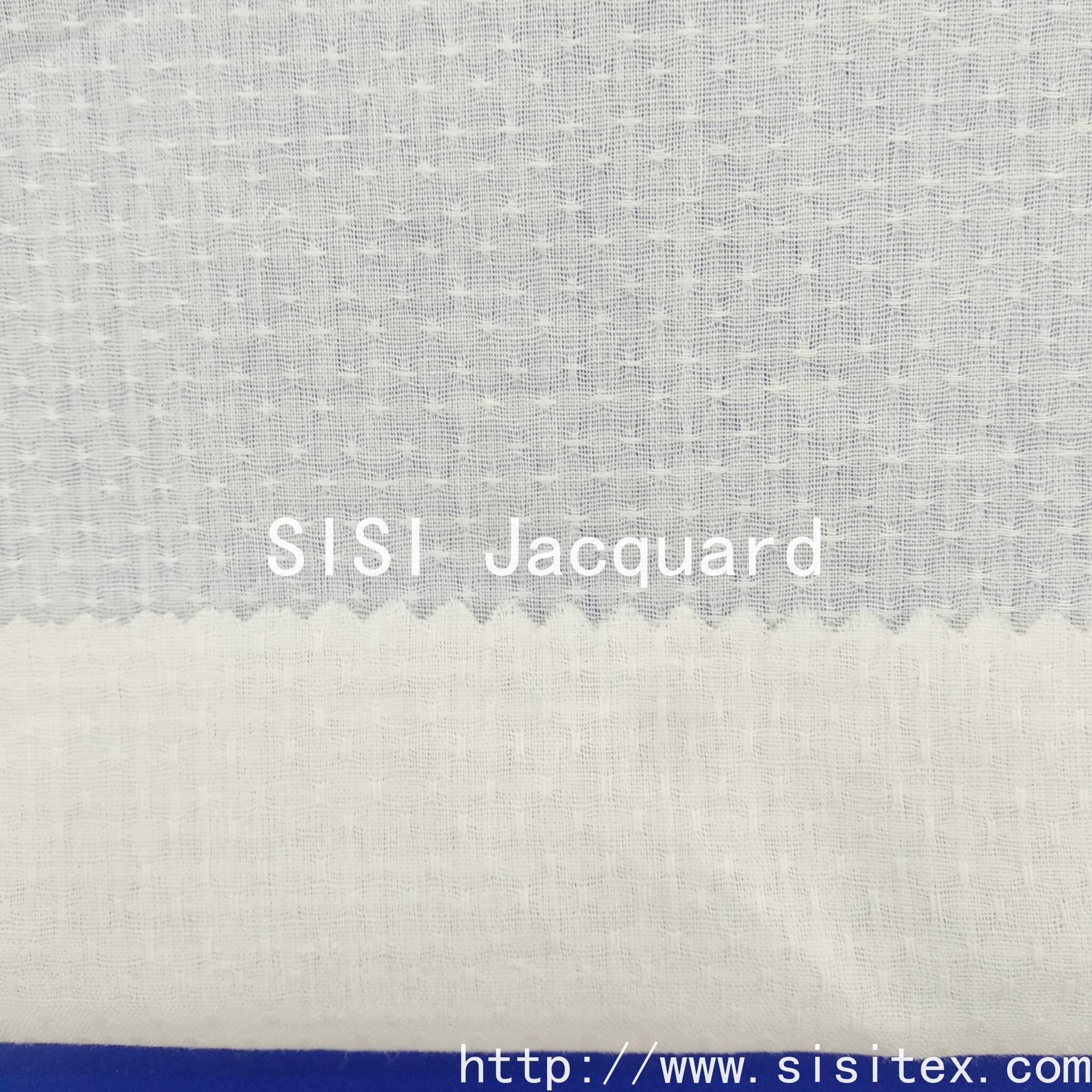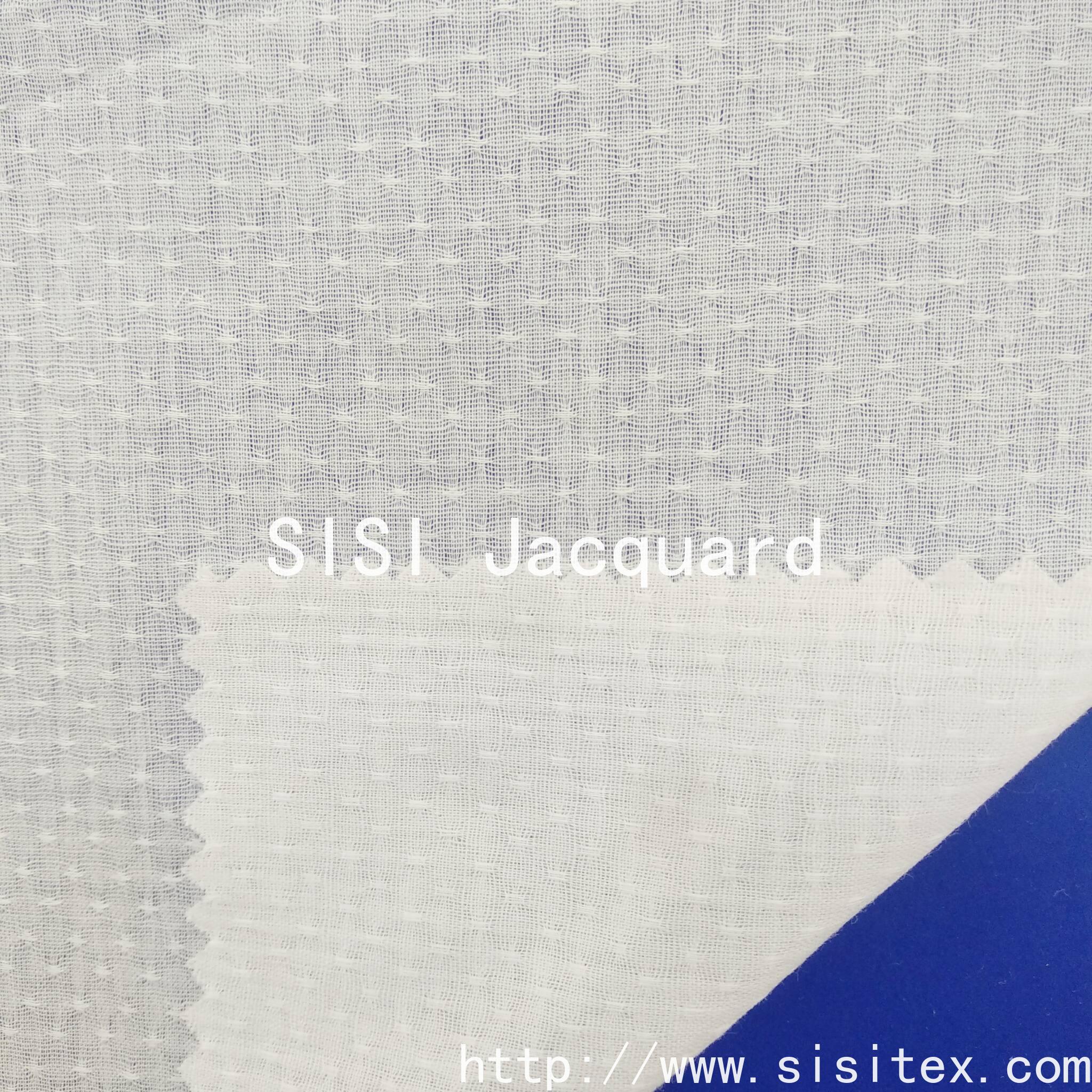 Shaoxing Sisi Textile Products Co., Ltd. produces "All-cotton Gauze Starry Sky Jacquard Fabric", which is woven with traditional gauze weaving techniques to create fine star-dotted jacquard patterns on a 100% cotton base. The fabric presents a unique translucent and hollowed-out effect, with star dot patterns that appear and disappear like stars in the night sky.
