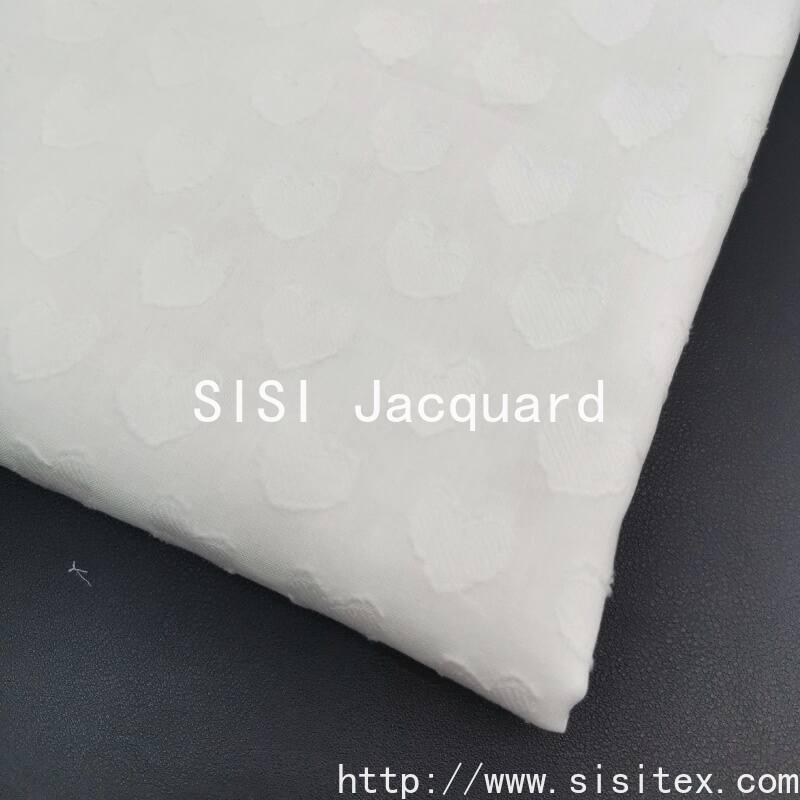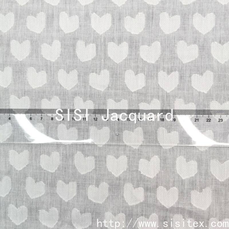 This fabric is made of 100% cotton as the base. Through a precise jacquard weaving process, it presents a three-dimensional heart pattern on the surface of the fabric, with clear and full texture. The unique embroidery design creates a faintly visible hollow effect around the heart pattern, enhancing the transparency and lightness of the fabric. The cotton material retains the natural softness and breathability of the fabric, while the combination of the heart jacquard and the embroidery adds a romantic and sweet atmosphere as well as a delicate craftsmanship to the fabric. As the light and shadow shift, the heart pattern appears and disappears, combining the softness of cotton with the structure of the jacquard, making it an ideal choice for creating sweet and fashionable items in the spring and summer seasons.