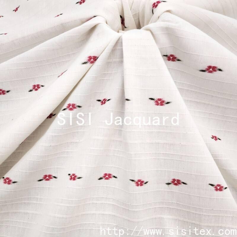 On the calm wine-red base fabric, white, light apricot and pale pink flowers bloom in a horizontal rhythm one after another. The weaving technique makes the boundaries between the flowers and the base clear and crisp, and the horizontal texture adds order to the flowers, with a slight sheen on the raised and recessed areas of the jacquard.