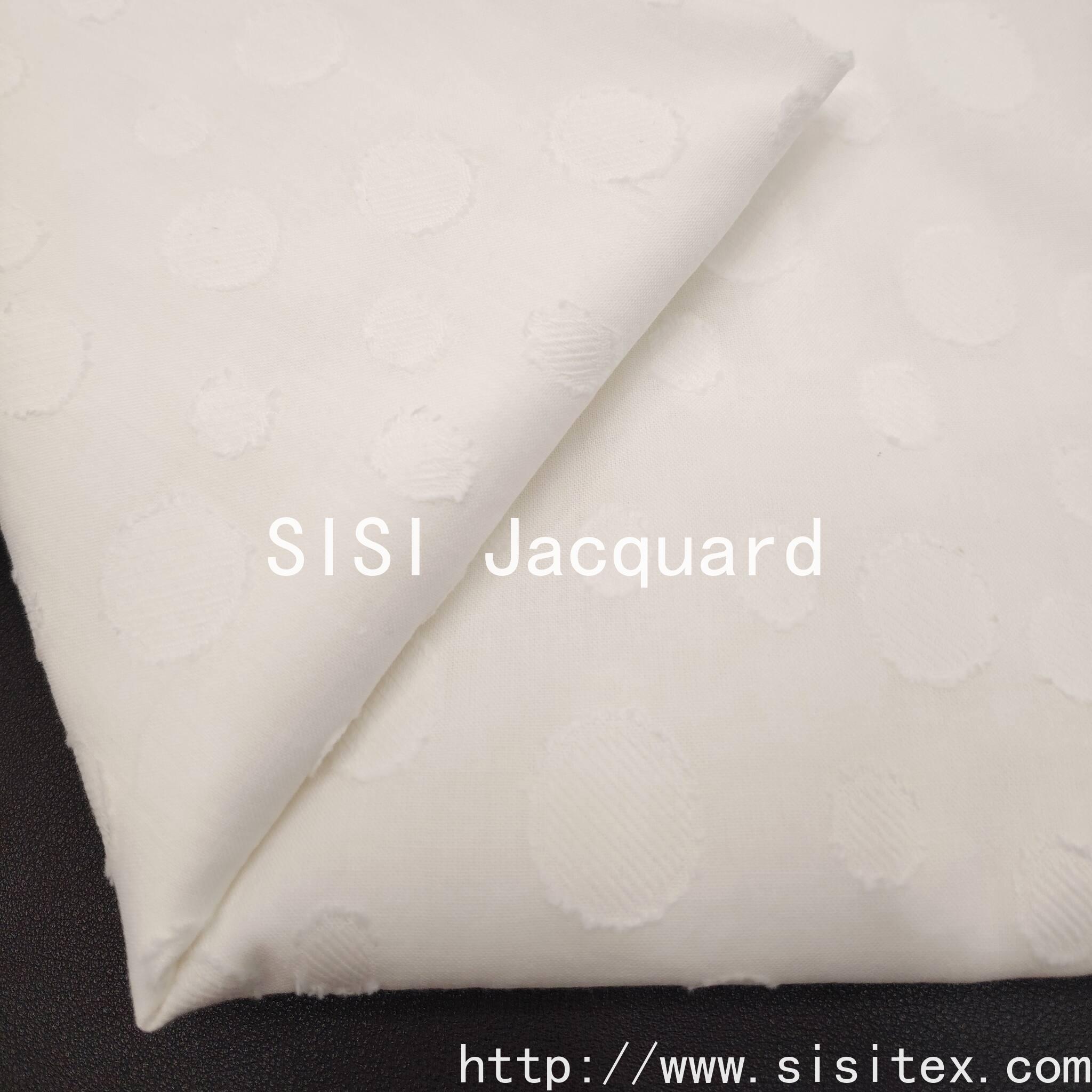 【Jacquard Circles, Three-Dimensional Embroidery】**Exquisite** Jacquard craftsmanship **is applied on the satin base**, **three-dimensionally weaving** fashionable **circle geometric patterns**. Gently touching the fabric, one can clearly feel the **distinctive texture**. This adds rich layers and delicate details to the smooth satin surface, **showing a brilliant glow from afar and distinct textures upon close inspection**.