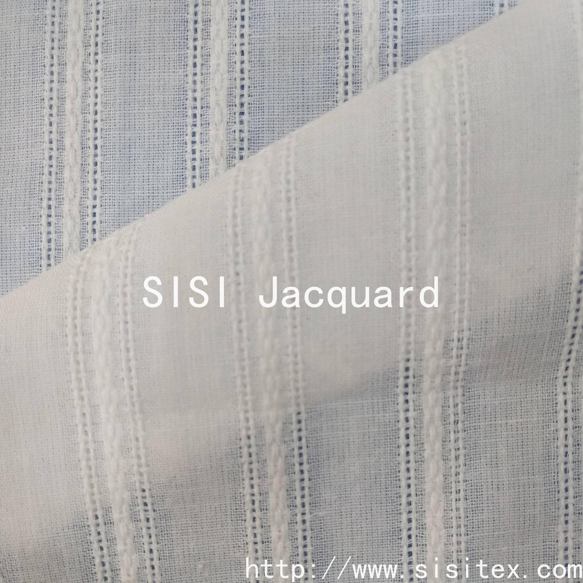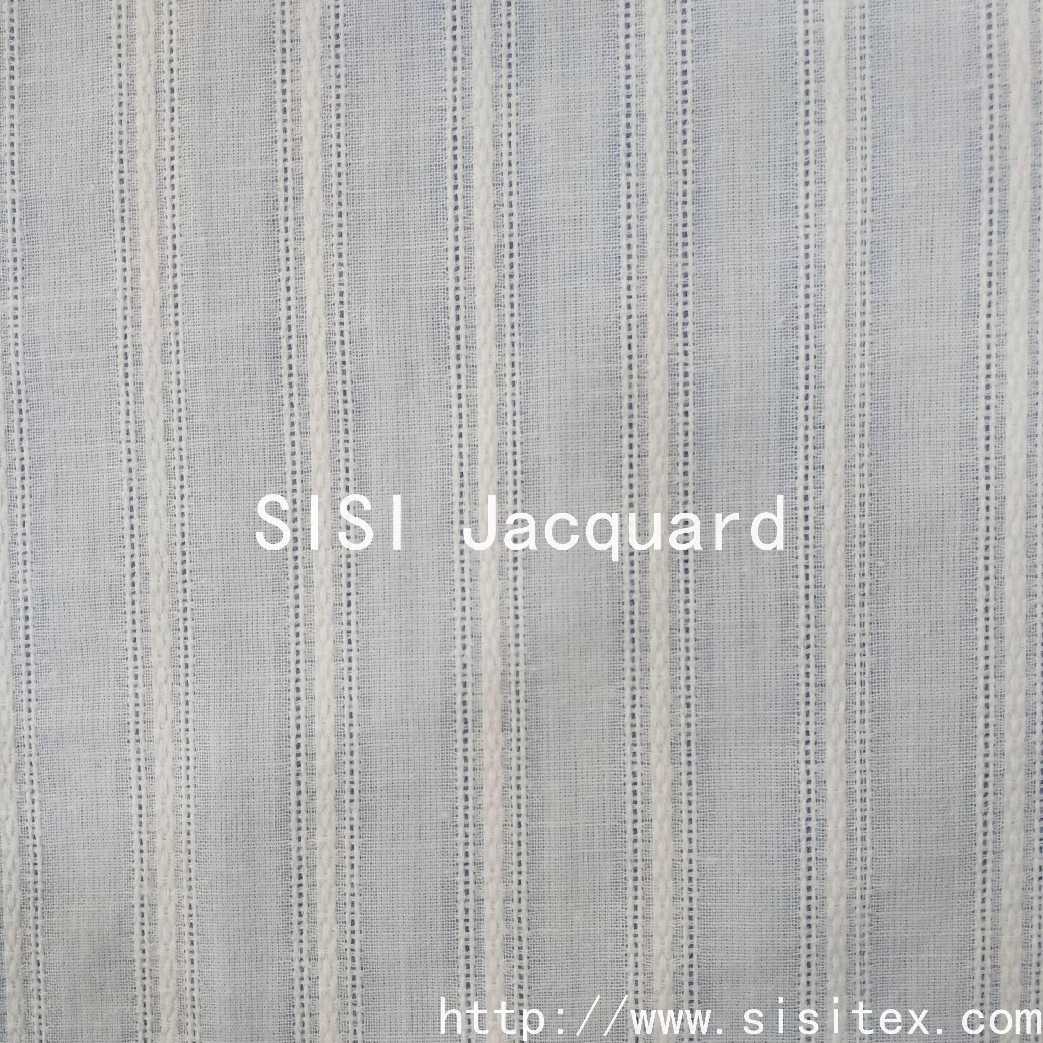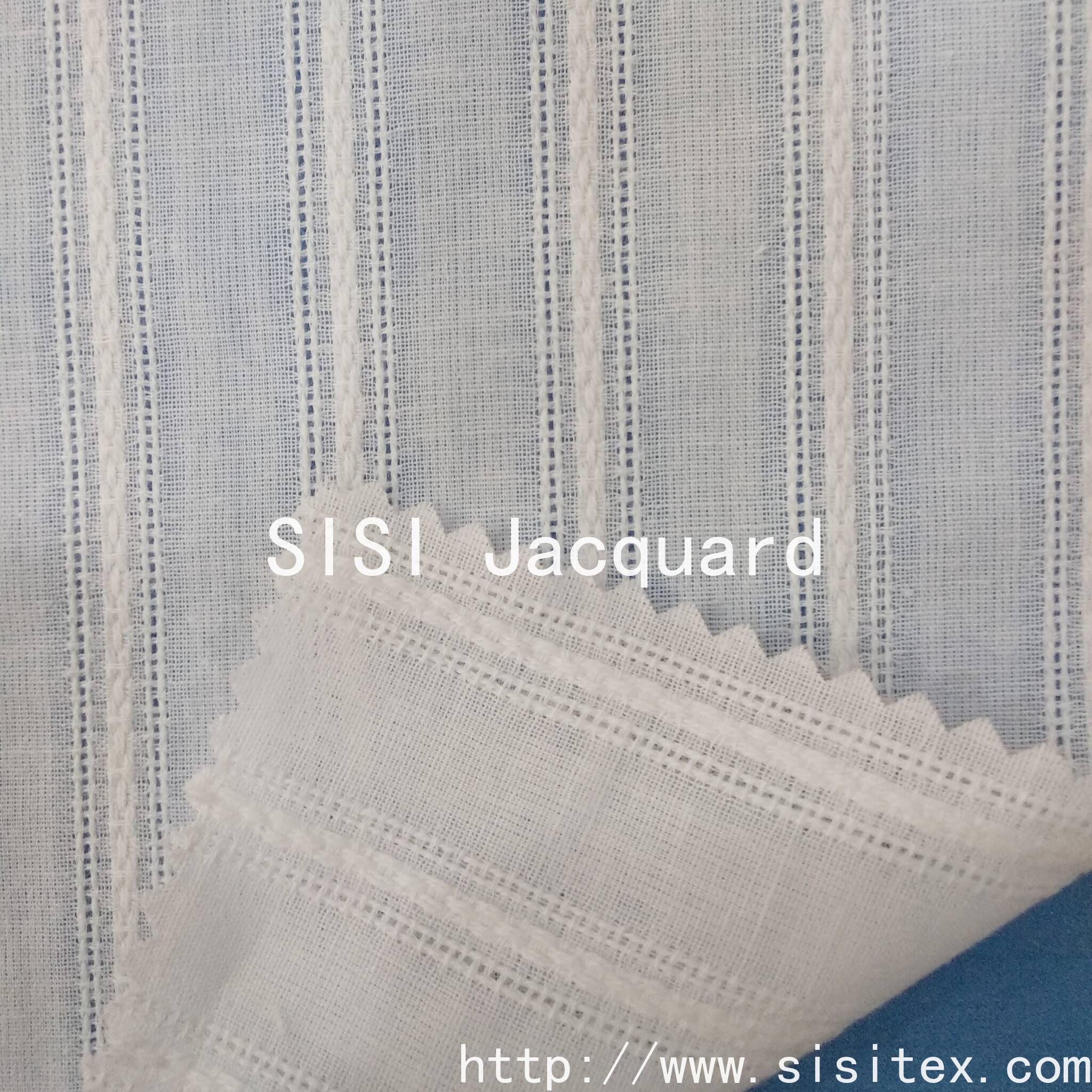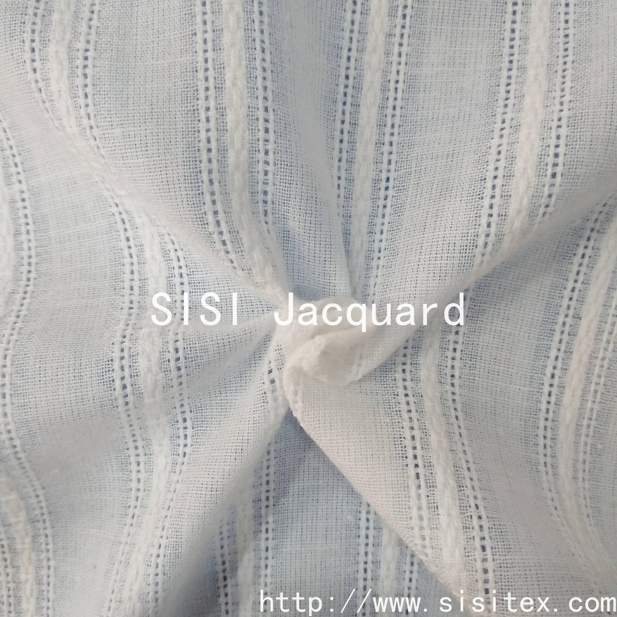 This is a cotton voile jacquard fabric with a wavy stripe and vertical stripe pattern. It is made from 100% cotton and features a precise jacquard technique to accurately display the three-dimensional texture of the wavy stripes and vertical stripes.