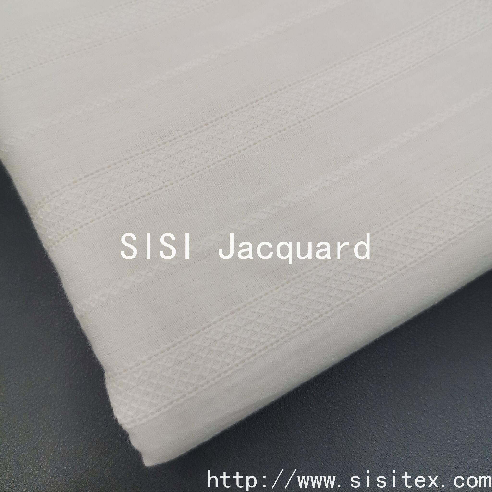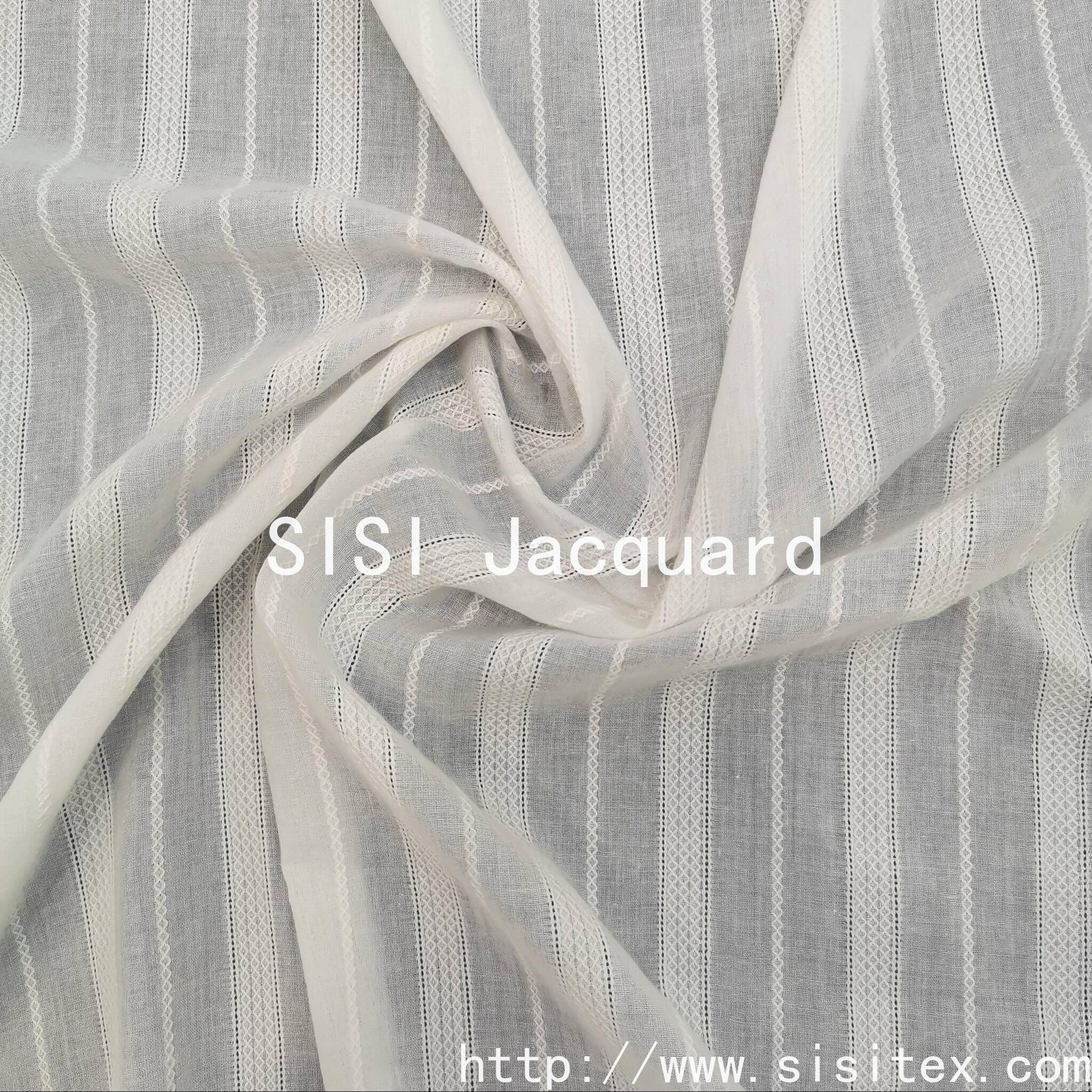 This is a 100% cotton voile jacquard fabric. It is made of natural cotton fibers and is soft, breathable, environmentally friendly and healthy. Through the jacquard weaving technique, the fabric presents a delicate and three-dimensional texture, retaining the transparency and lightness of voile while also giving it a refined artistic touch.