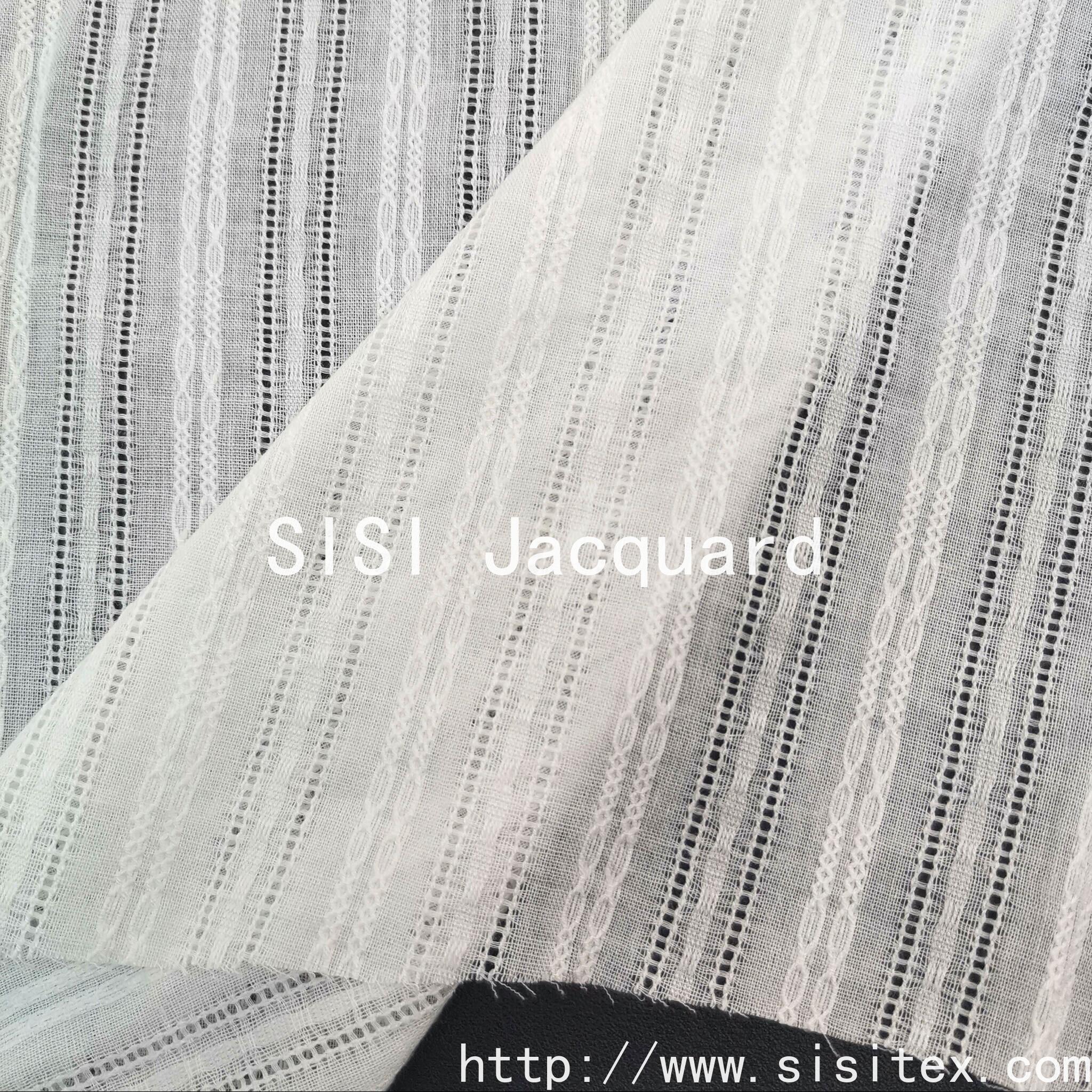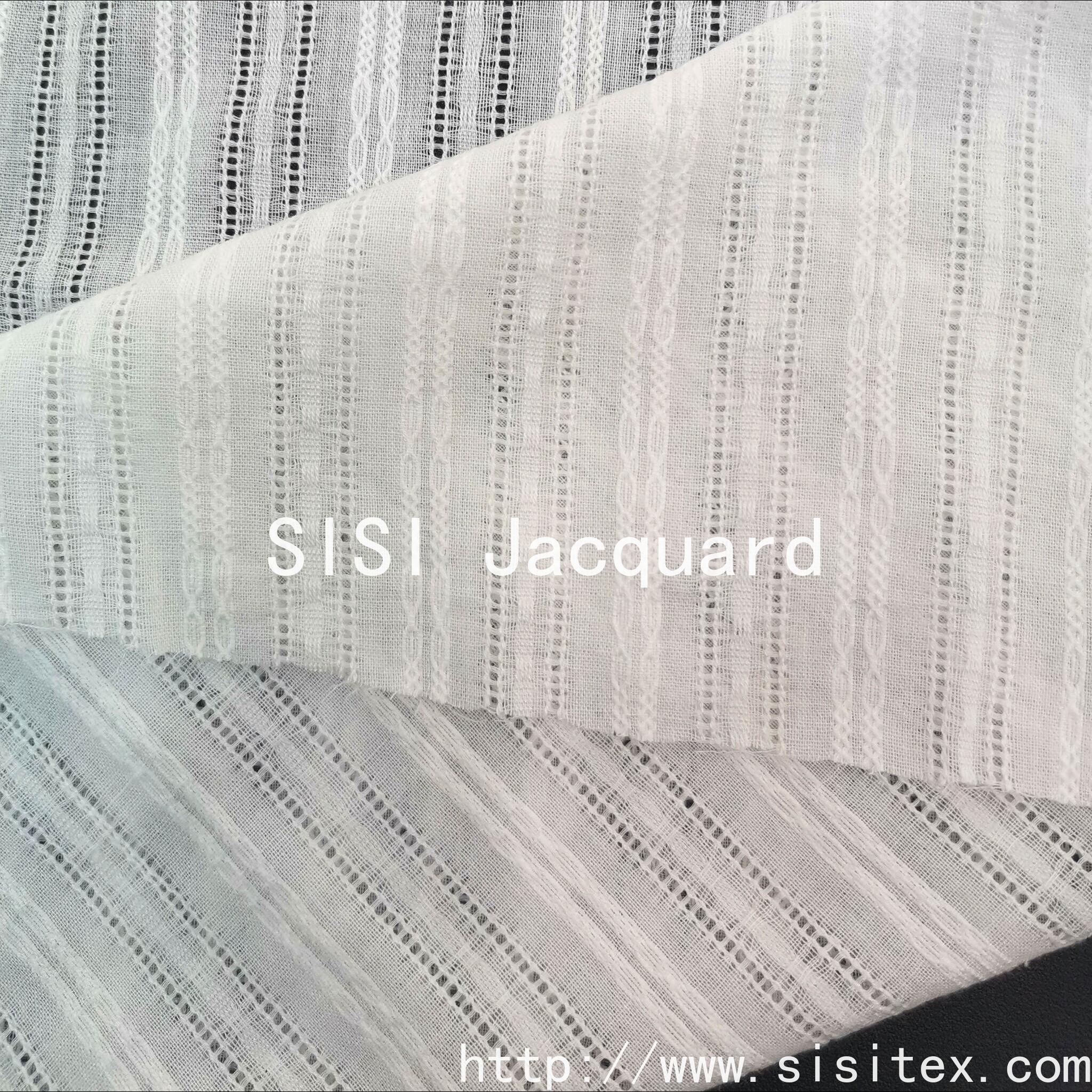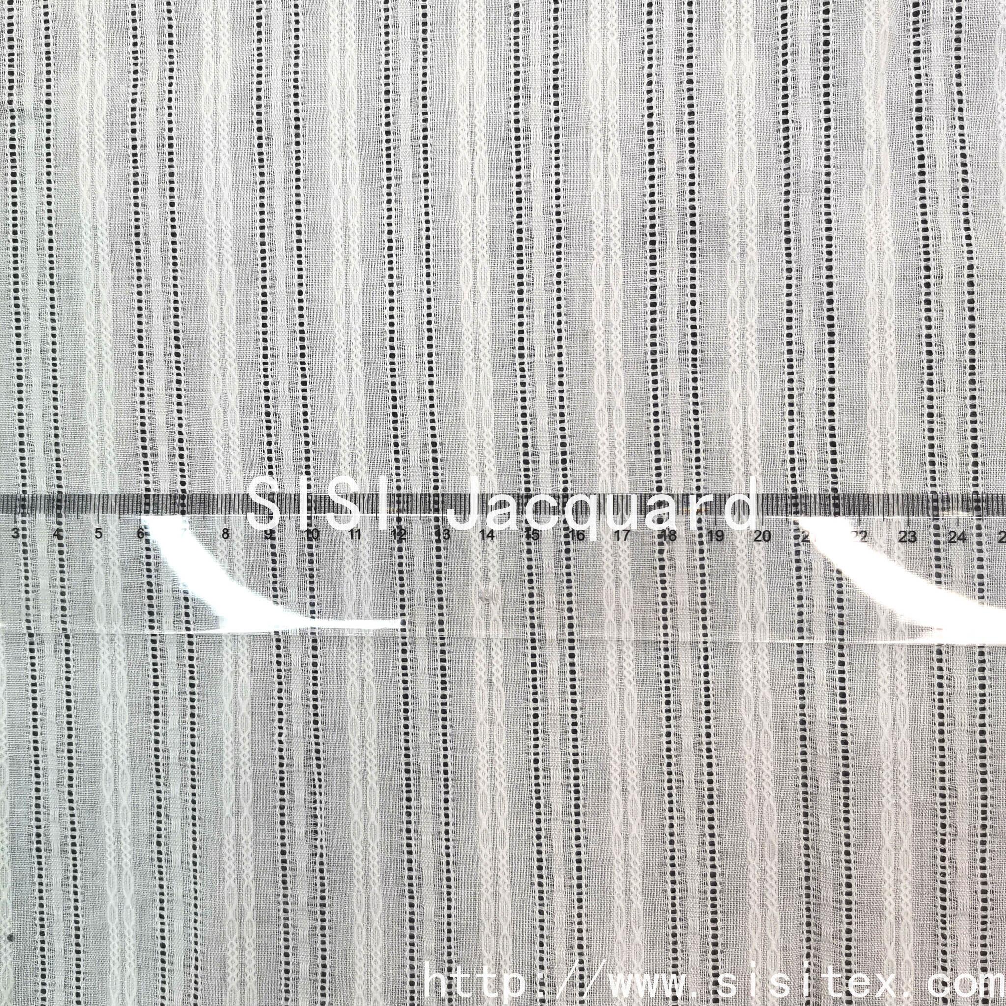 This is a 100% cotton mesh jacquard fabric with openwork stripes. It combines the properties of "skin-friendly and breathable" as well as "environmentally friendly and sustainable". The fabric is made using the mesh openwork technique, creating a transparent and lightweight visual effect; at the same time, through the jacquard technology, it presents delicate textures, achieving a balance between "breathability" and "fineness".