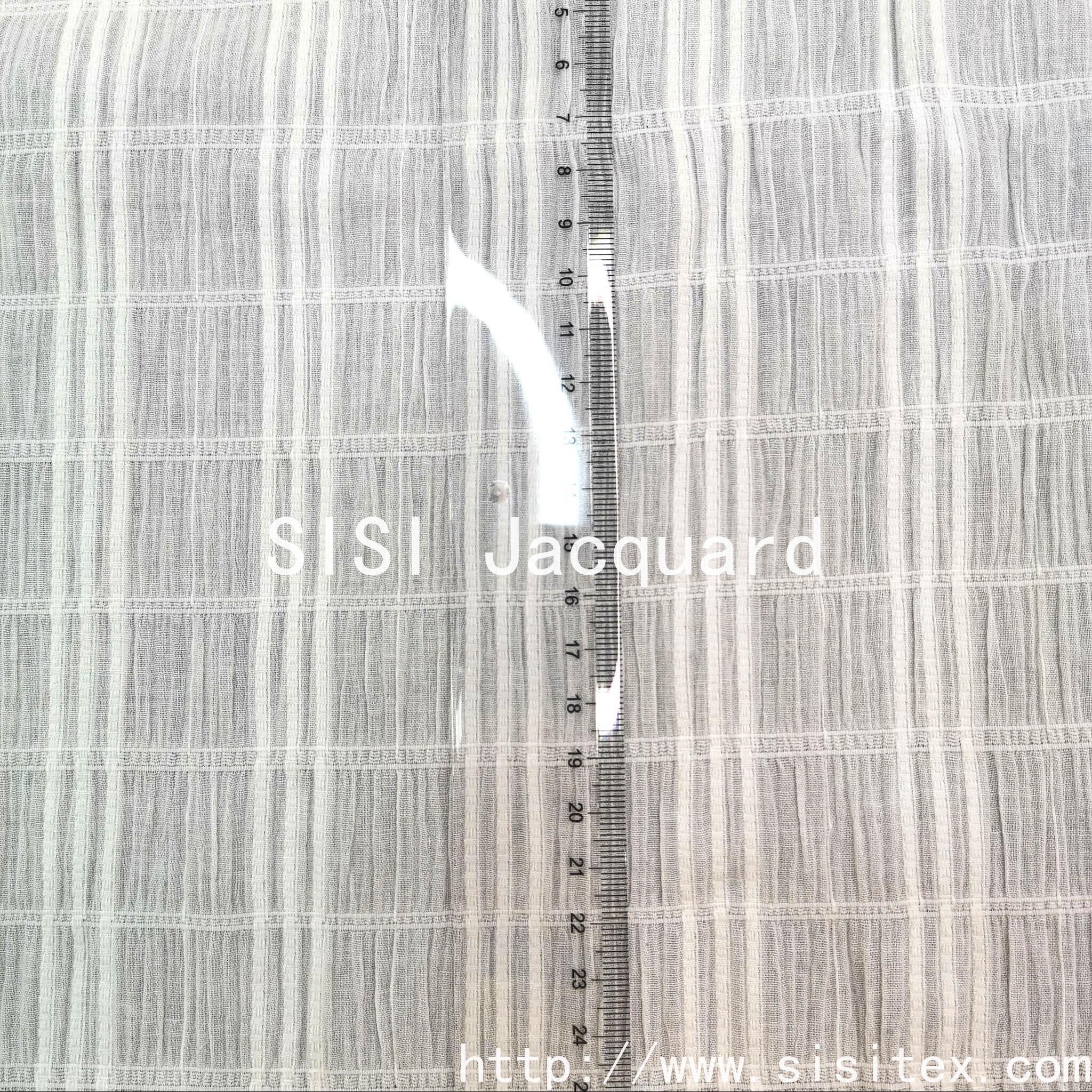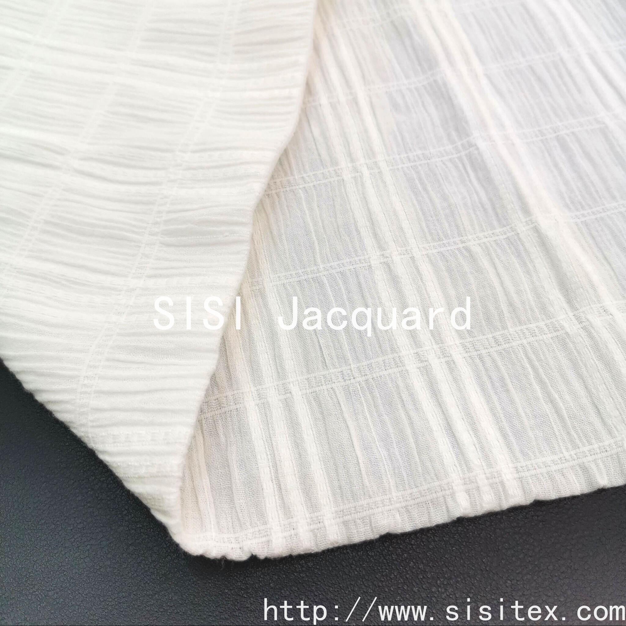 This product is made of cotton jacquard bubble fabric with stretch crepe texture. It is made of natural cotton, which is soft, breathable and comfortable to the skin. The jacquard pattern creates a three-dimensional and fluffy texture, and the elasticity is suitable for various body shapes. The combination of 97% cotton and 3% spandex ensures softness and breathability of the cotton, while the spandex provides elasticity. The jacquard technique creates a three-dimensional texture, with bubble wrinkles being fluffy and crepe fabric having a draping effect. Both visual and tactile experiences are upgraded. It is made of natural cotton, comfortable to the skin, with a three-dimensional fluffy texture, suitable for various body types, and suitable for daily wear in spring and summer. The combination of the fluffy bubble wrinkles, the draping effect of the crepe fabric, and the elastic properties meet the functional requirements of "lightweight and breathable + multi-scenario adaptability", and is suitable for daily and casual scenarios in spring and summer.