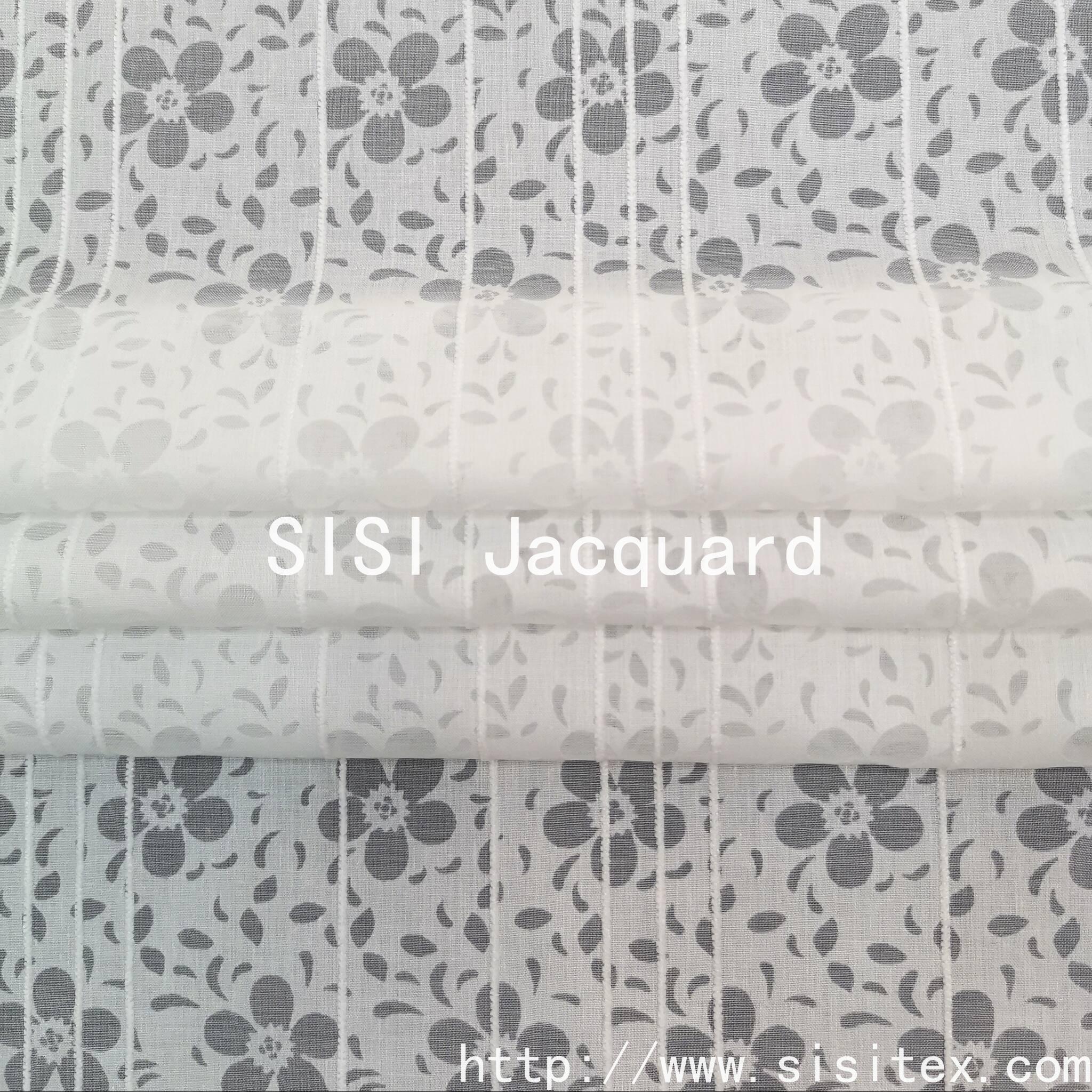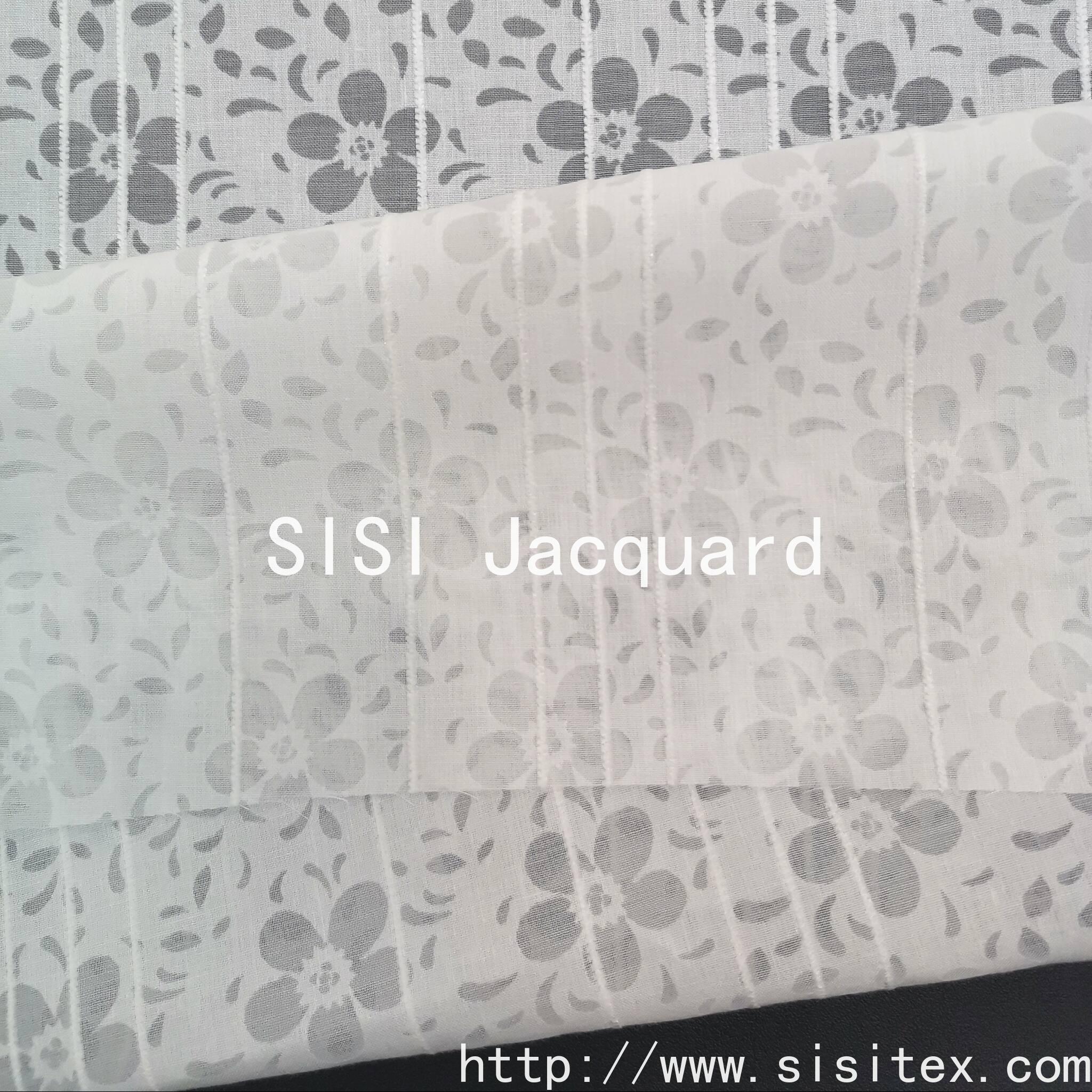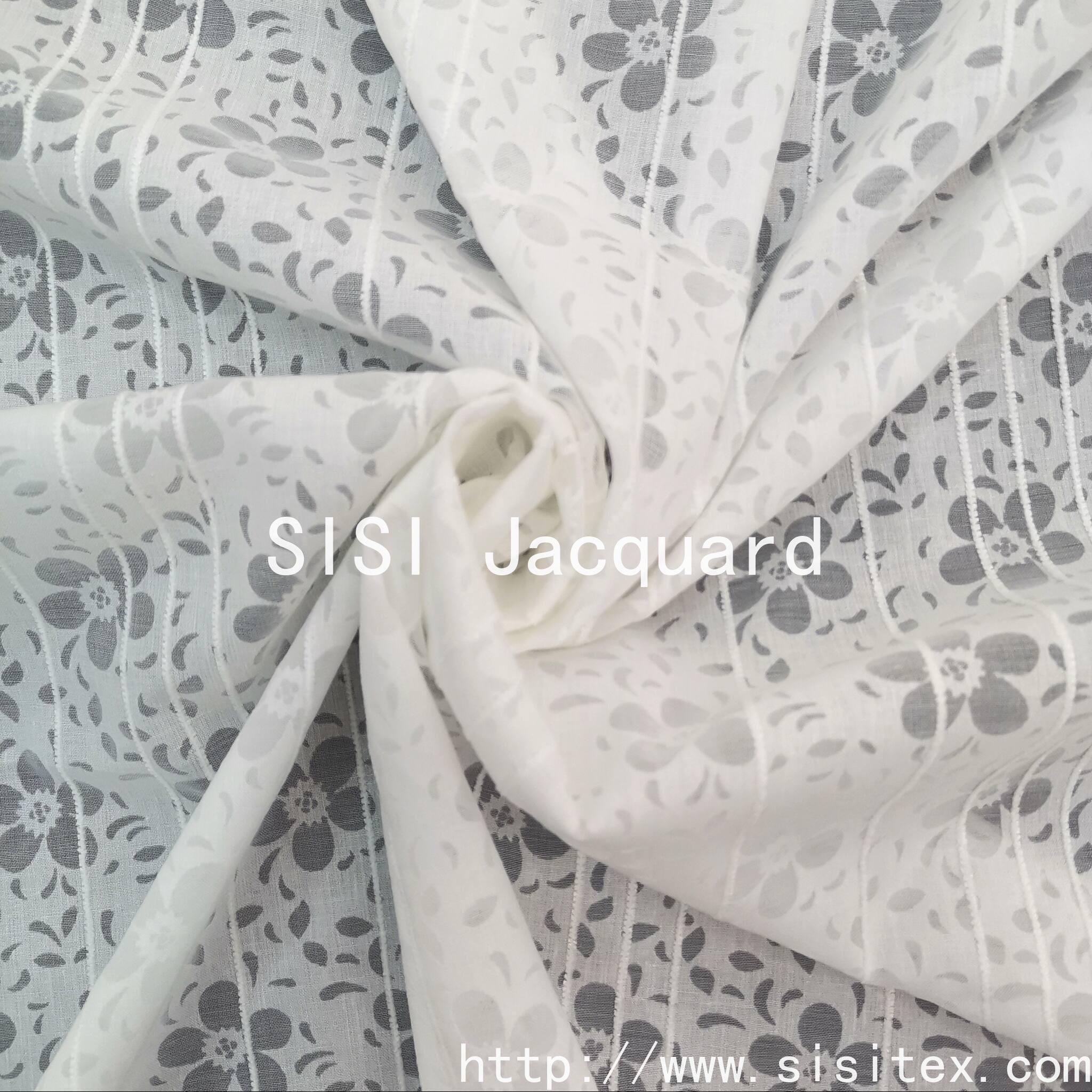 This product is made of CVC 55% cotton and 45% polyester, with a floral jacquard and printed pattern fabric. It is a lightweight and breathable design fabric suitable for spring and summer women's wear and home textiles.
