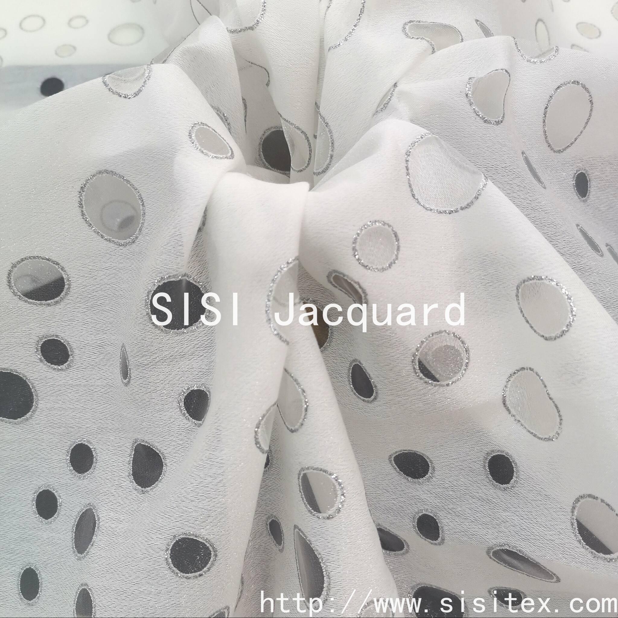 This product is the TR Gold-stamped round circles with damaged and burned flowers fabric SS18754-Y1. It is made through the burning process, where chemical agents selectively remove the fibers to create natural, irregular circular patterns. It combines the retro and incomplete aesthetic with modern artistic appeal. The combination of TR fabric and the burning process not only retains the anti-wrinkle and wear-resistant properties of the TR fabric, but also gives the fabric a unique three-dimensional relief effect and perforated design, making it an important design in the spring and summer clothing and home decoration fields.