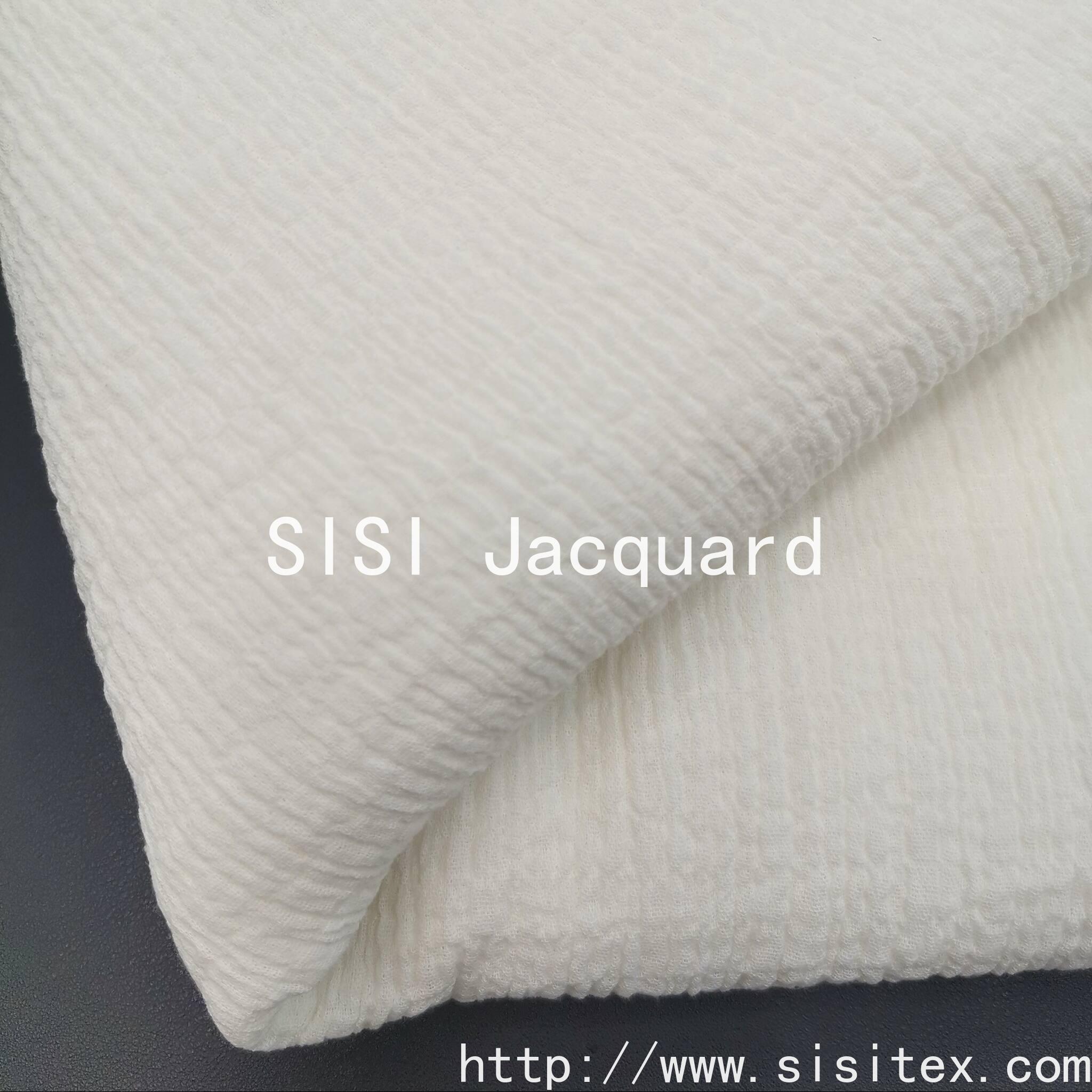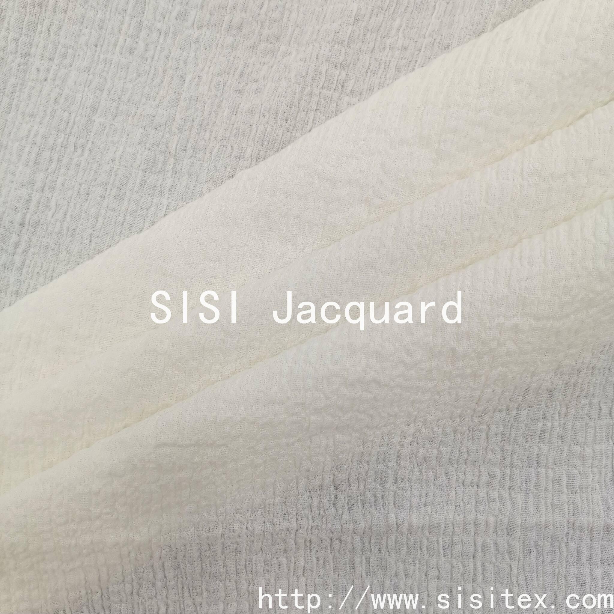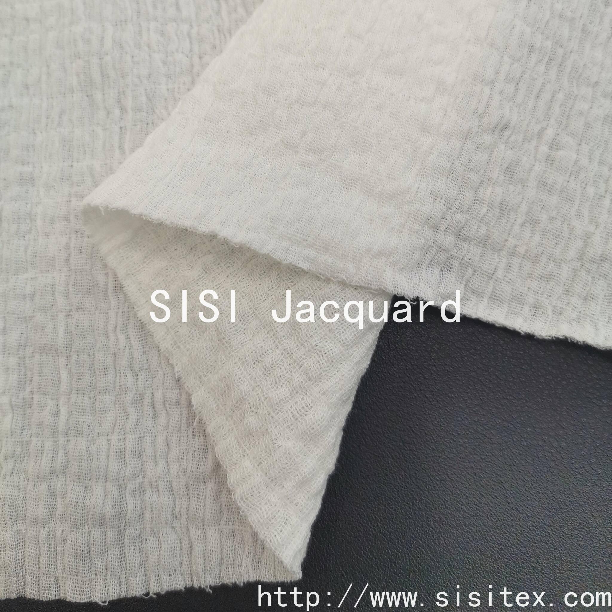 This product is a woven all-cotton stretch crepe fabric with double jacquard pattern SS18268. It is made with a perfect 97% cotton and 3% spandex ratio, integrating the texture of crepe fabric, the exquisite craftsmanship of double jacquard, and the comfortable experience of micro elasticity. The fabric has a soft and elastic feel, and the subtle wrinkles on the surface are the artistic touch left by time. The natural crepe fabric's natural wrinkles bring a casual artistic touch. The double jacquard technique gives the fabric different patterns or colors on both sides, offering a highly designed depth.