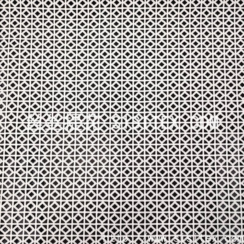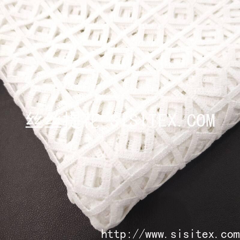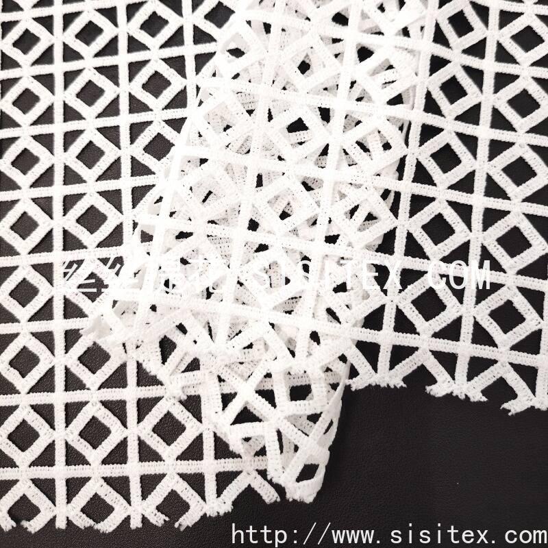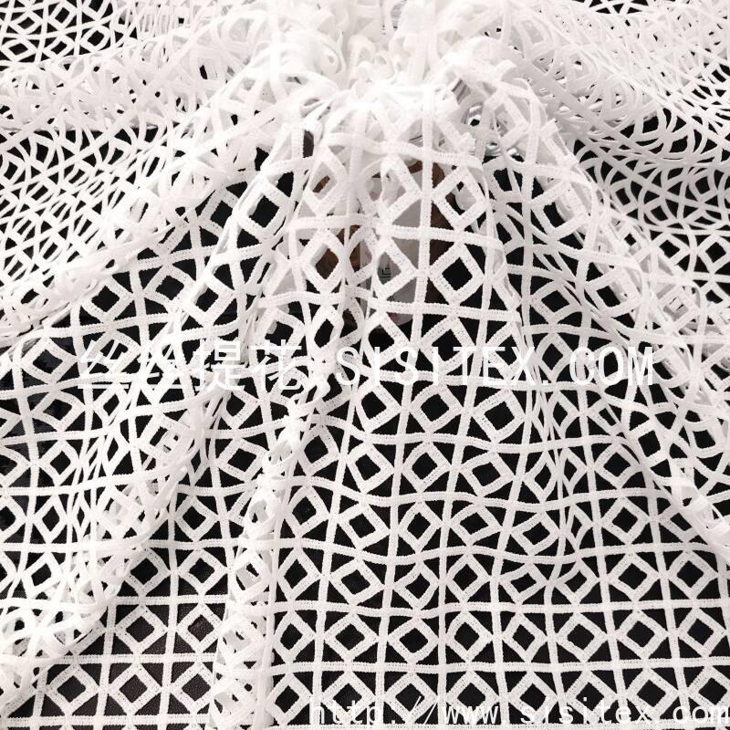 本款面料采用100%涤纶牛奶丝底布,结合水溶绣工艺,绣制出立体通透的几何格子图案。面料幅宽130cm,质地丝滑柔软,带有细腻光泽,绣花部分通过水溶技术形成清晰镂空格纹,呈现若隐若现的透肌效果。整体风格简约现代,兼具柔美气质与通勤实穿性,适合打造春夏衬衫、连衣裙及高雅家居饰品。