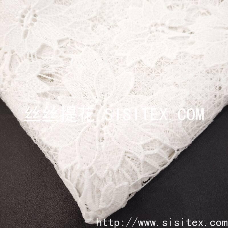本款面料采用100%涤纶底布,以传统水溶绣工艺精细绣制出立体通透的花朵蕾丝图案。绣花部分层次分明,花型婉约繁复,通过水溶技术形成细腻镂空,呈现蕾丝般的精致透肌感。面料幅宽130cm,质地轻盈柔滑,带有微妙光泽,整体风格复古浪漫,兼具艺术美学与实穿性,适用于婚纱、礼服、复古女装及高雅家居装饰。