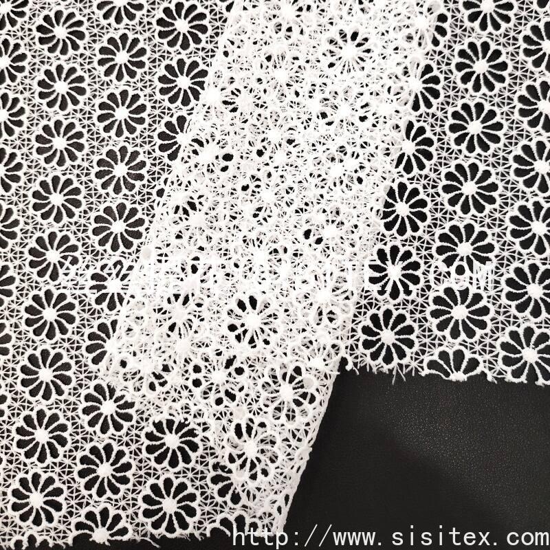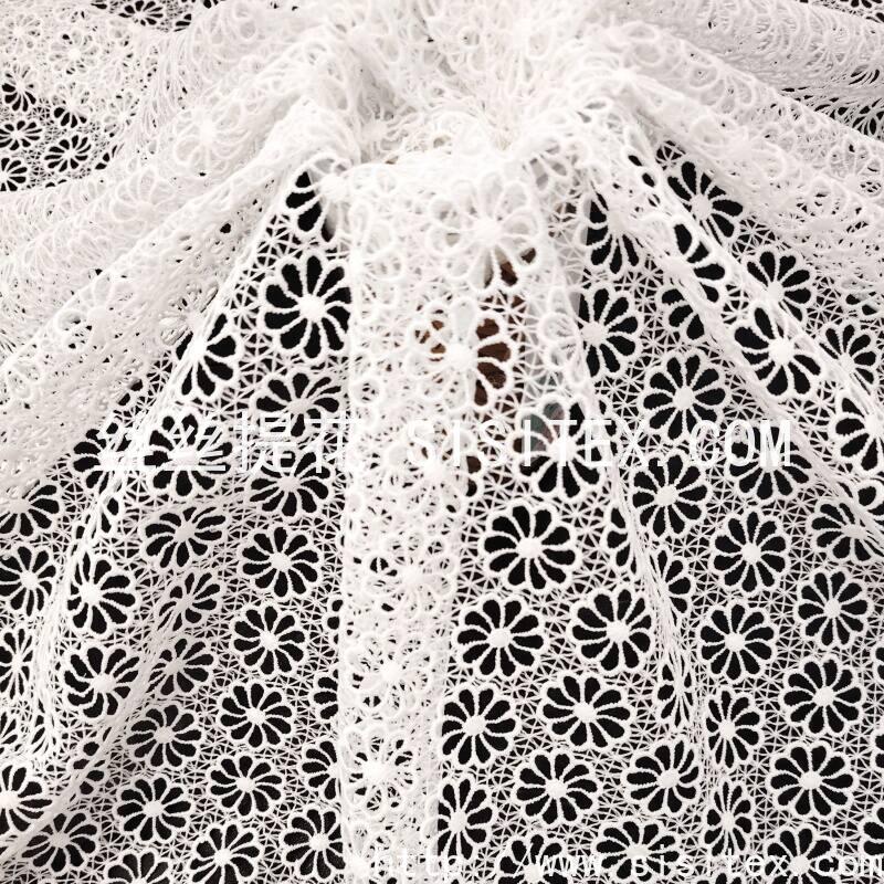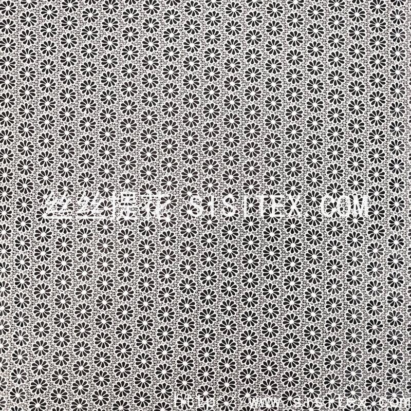 本款面料采用100%涤纶牛奶丝底布,以满幅水溶绣工艺绣制出均匀分布的圆形镂空图案。绣花覆盖整个面料,圆形孔洞通过水溶技术形成规整透肌纹理,呈现细腻的光影层次。面料幅宽130cm,质地丝滑柔顺,带有自然光泽,整体风格简约而富有现代感,兼具柔美气质与结构美学,适合打造春夏衬衫、连衣裙及轻奢家居饰品。