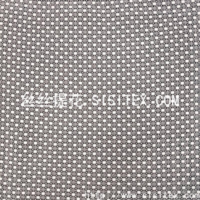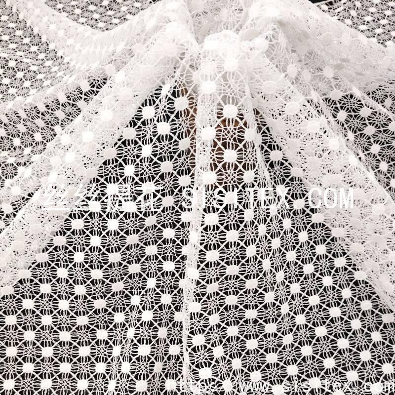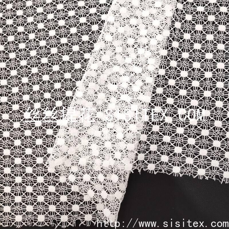 本款面料采用100%涤纶底布,以满幅水溶绣工艺绣制出规则分布的几何镂空图案。绣花均匀覆盖面料,孔洞纹理通过水溶技术形成细腻规整的透肌效果。面料幅宽130cm,质地柔软轻盈,带有一定的挺括度与垂坠感,整体风格简约现代,兼具几何秩序感与朦胧柔美气质,适合打造春夏通勤装、连衣裙及现代家居饰品。