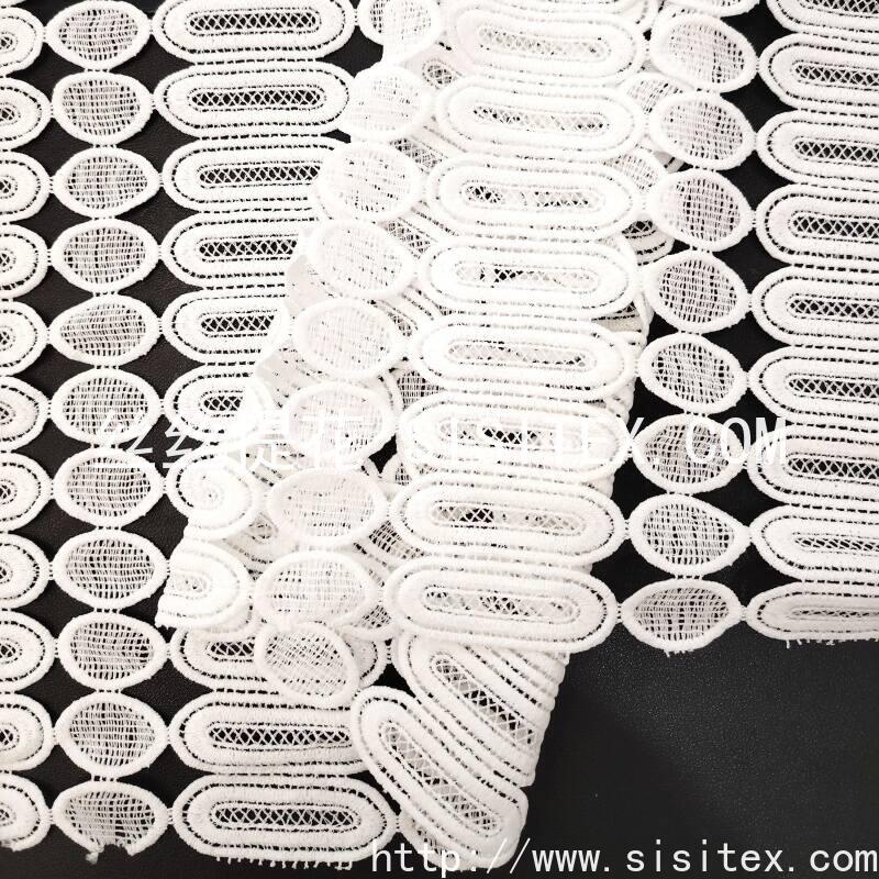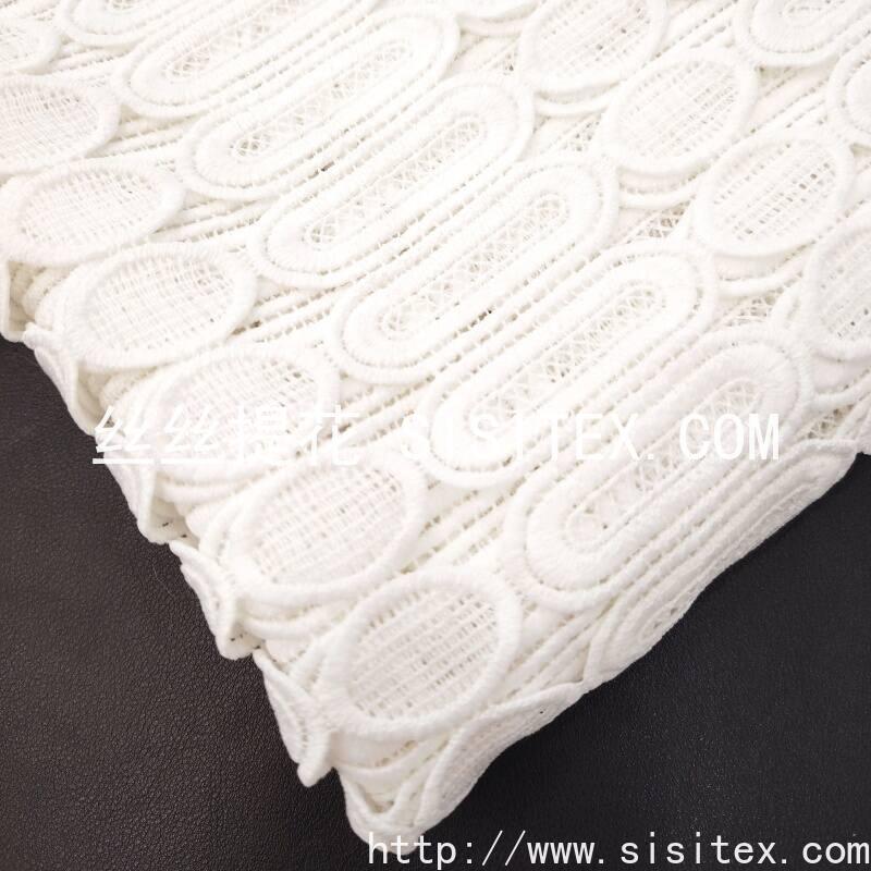 本款面料采用100%涤纶牛奶丝底布,以水溶绣工艺绣制出规则排列的几何圆圈图案。绣花部分形成立体圆环透肌纹理,圆圈大小均匀,边缘清晰,整体呈现出轻盈通透的视觉效果。面料幅宽130cm,质地丝滑柔顺,带有细腻光泽,兼具柔美气质与现代简约感,适合打造春夏衬衫、连衣裙及高雅家居软装。