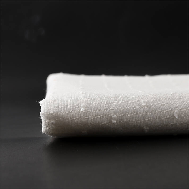 本款面料采用100%优质棉纤维,通过**空扣条织造工艺**与**纱罗结构**结合,形成独特的透气镂空纹理;表面点缀立体**毛球剪花**装饰,搭配精致的**提花图案**,兼具视觉层次感与触觉趣味性。面料柔软亲肤,吸湿透气,完美平衡了装饰性与实用性。