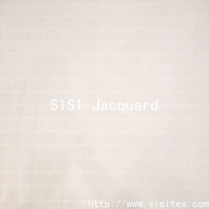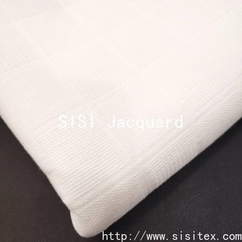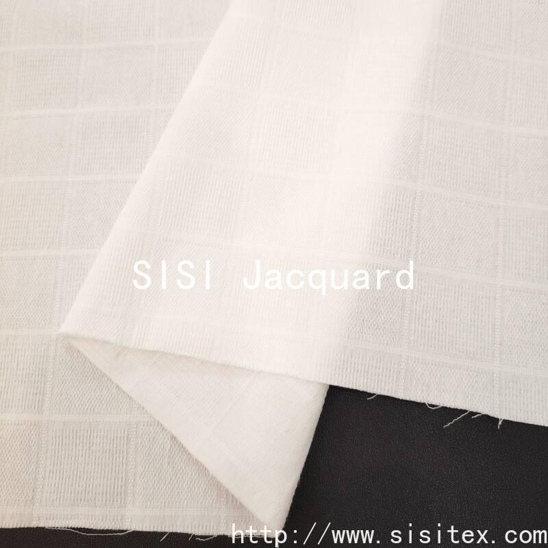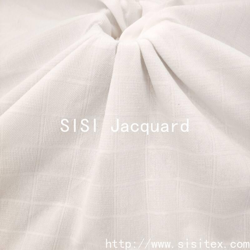 This cotton texture checked jacquard fabric is made by finely spinning 100% cotton yarn and is woven through a jacquard process to create a delicate geometric pattern. The surface presents a clear and undulating texture effect. The fabric density is 106×57, with a weight of 185g/㎡. It has a thick and full texture, a soft feel and a supportive quality. The pure white tone highlights the subtle layers of the checked pattern. The overall style is simple yet detailed, combining the freshness of Japanese and Korean styles with the structural aesthetics of modern design. It is suitable for various thick and stylish clothing and home products.