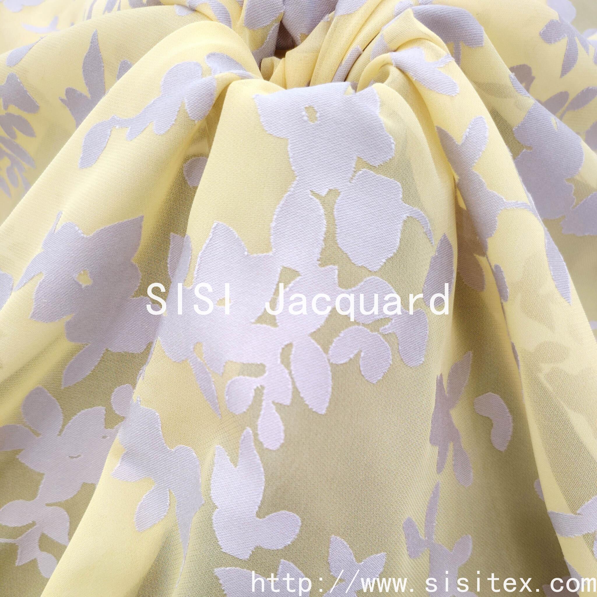 独特烧花工艺:通过精准的烂花技术,蚀去35%的人棉,留下65%的涤纶骨架,形成鲜明、通透的虚实对比图案。