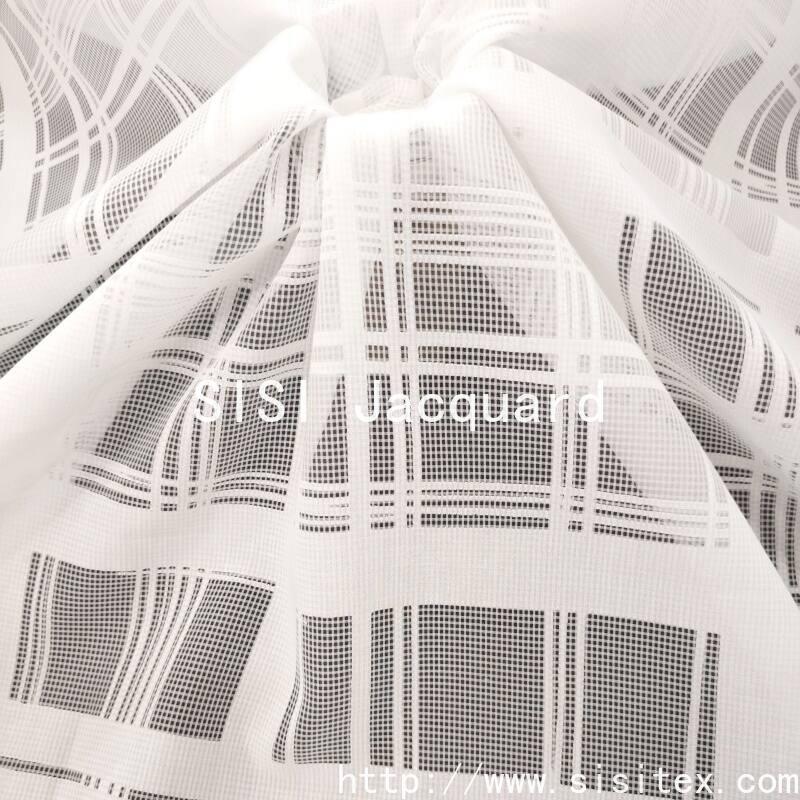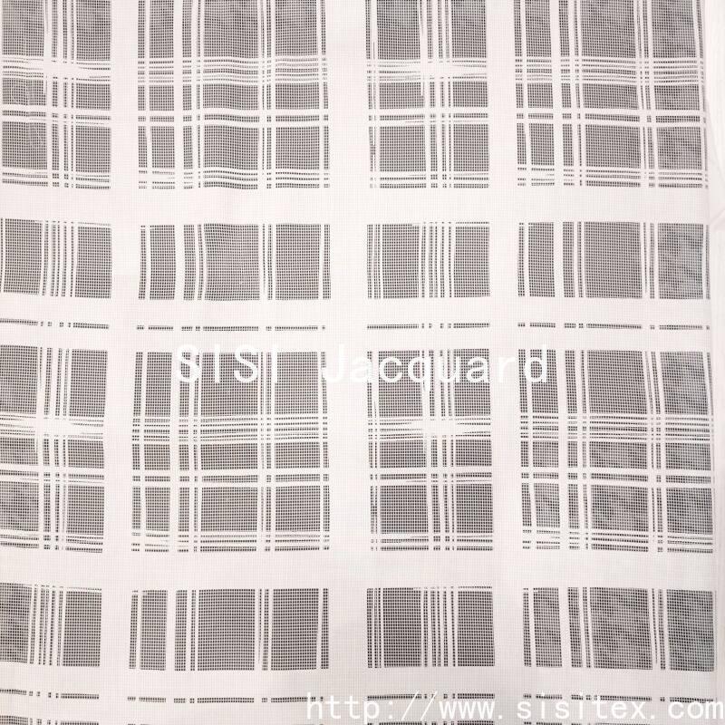 This fabric is a blend of 50% polyester and 50% cotton. It is processed through a jacquard technique to create a clear and three-dimensional geometric check pattern with open spaces. The fabric weighs only 85g per square meter and has a width of 145cm. It is lightweight and soft in texture. The geometric pattern retains the original appearance of the fabric, while the open areas present a transparent texture. Polyester provides shape retention and a crisp feel, while cotton enhances skin comfort and breathability. The overall style combines modern geometric aesthetics with practical functionality, making it suitable for creating light and layered outfits for the spring and summer seasons.