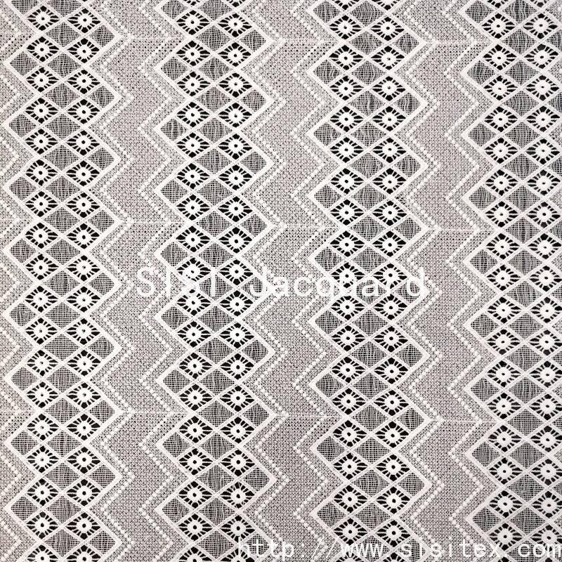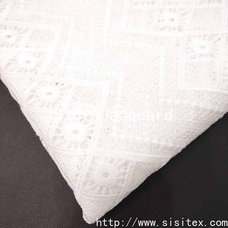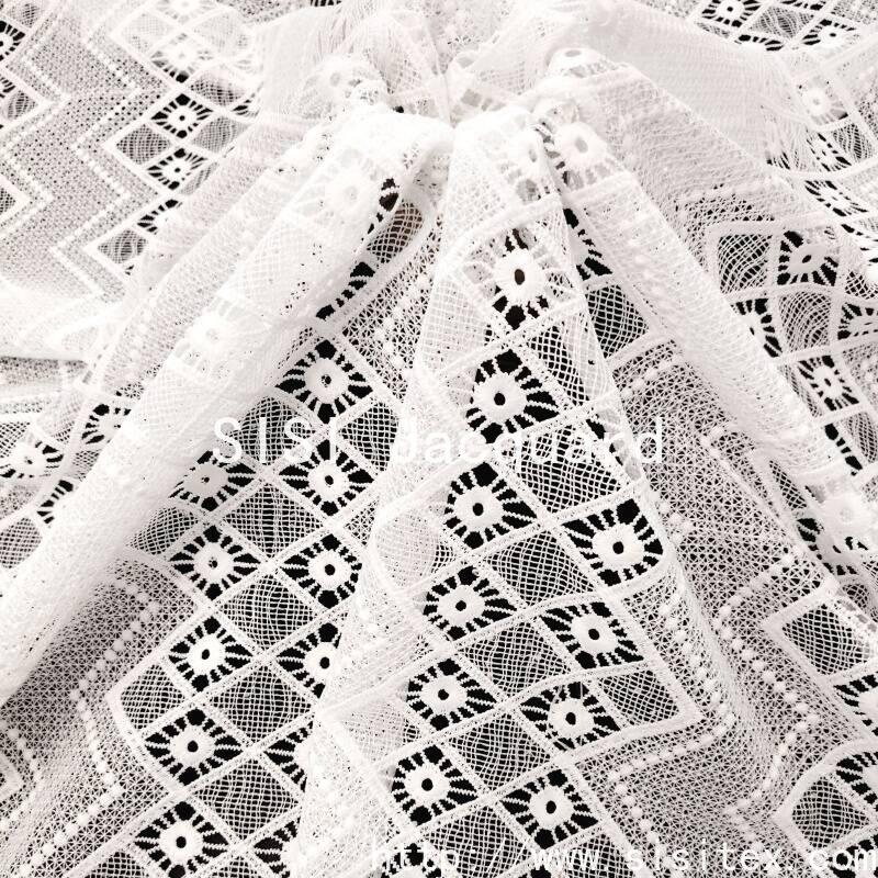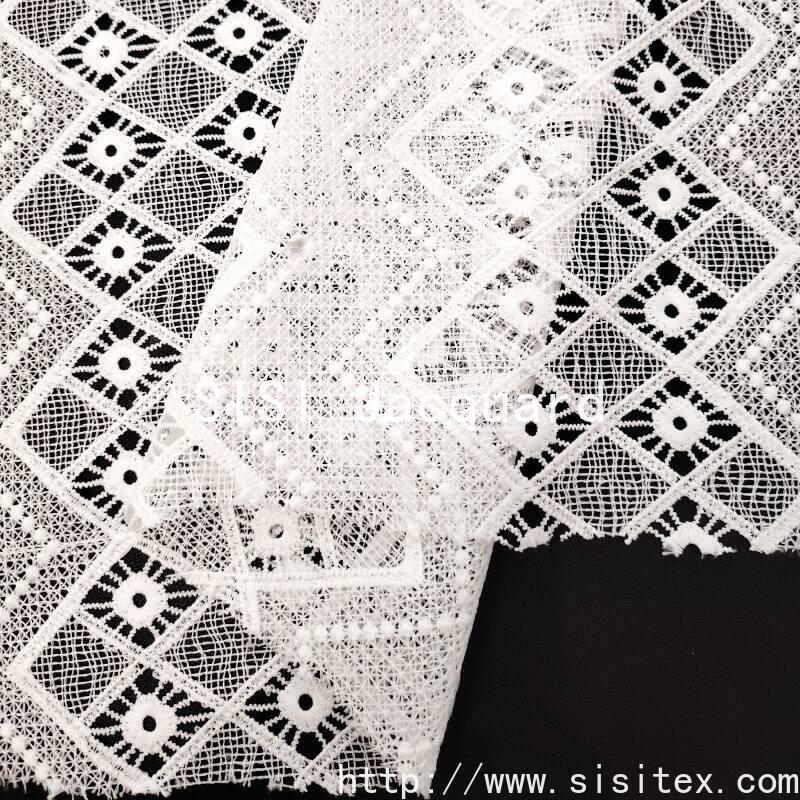 This fabric is made of 100% polyester base fabric, combined with meticulous water-soluble embroidery technique, to create three-dimensional relief-style geometric pattern embroidery. The fabric width is 130cm, and the embroidered part is transparent and hollow, with clear and layered patterns. The base fabric is lightweight and soft. Water-soluble embroidery is achieved through a unique process, integrating the embroidery and the hollowing-out into one piece. The overall style is refined and modern, combining visual artistic appeal with practicality. It is suitable for creating wedding gowns, fashionable women's clothing, and elegant home accessories for the spring and summer seasons.