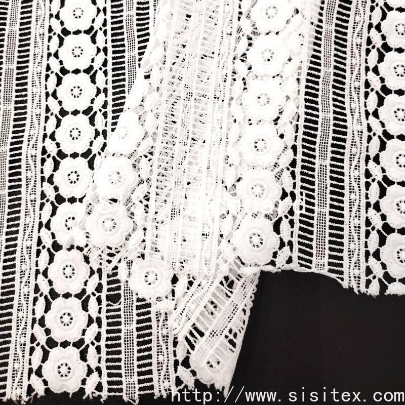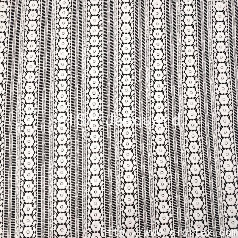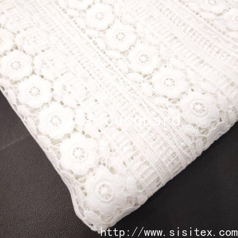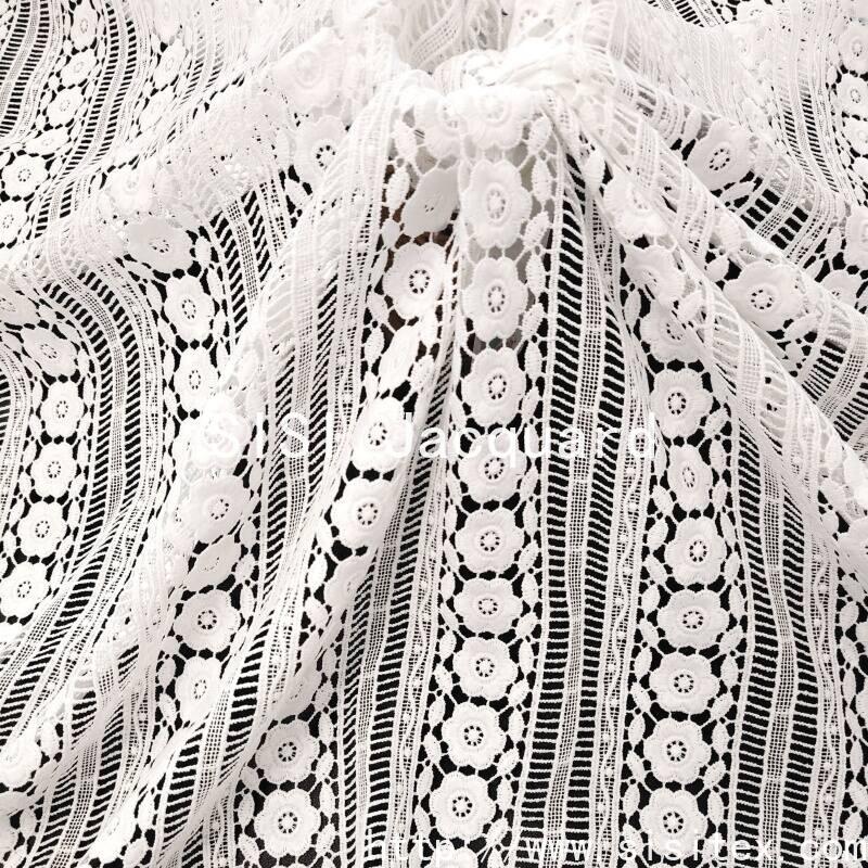 This fabric is made of 100% pure cotton base fabric. It is embroidered using traditional water-soluble embroidery technique, creating a three-dimensional and transparent pattern of hollowed-out flowers. The embroidered part is delicate and distinct, with a graceful and lively flower shape. Through the water-soluble technology, it forms a natural and breathable hollow texture, resembling lace in its fineness. The cotton base fabric is soft and skin-friendly, with excellent breathability. Combined with the exquisite embroidery, it presents a romantic and light artistic style. It is suitable for creating wedding dresses, formal gowns, high-end women's clothing, and elegant home textiles.
