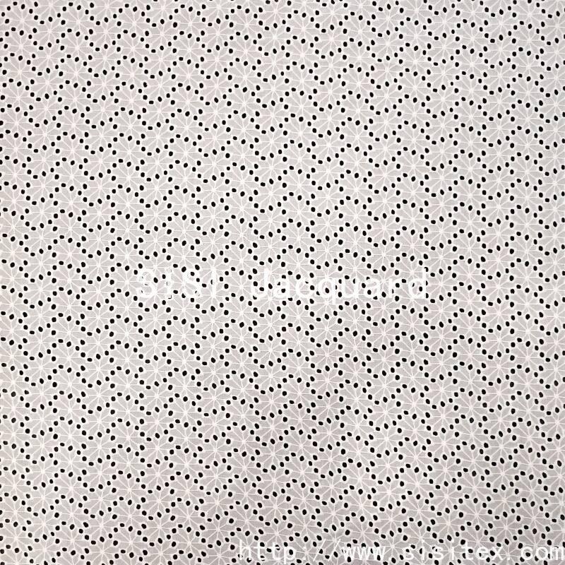 This fabric is made of 100% combed cotton (JC60×JC60). Through a meticulous镂空 embroidery technique, a full-patterned plant flower-shaped perforation pattern is embroidered onto the fabric. The embroidered holes are evenly and delicately distributed, with a natural and soft flower shape, creating a transparent yet flexible texture. The fabric width is 135cm. It has a soft and skin-friendly texture, with cotton fibers providing excellent breathability and moisture absorption. The overall style is fresh and artistic, featuring a natural breathing sensation and artisanal warmth. It is suitable for summer shirts, dresses, and elegant home accessories.