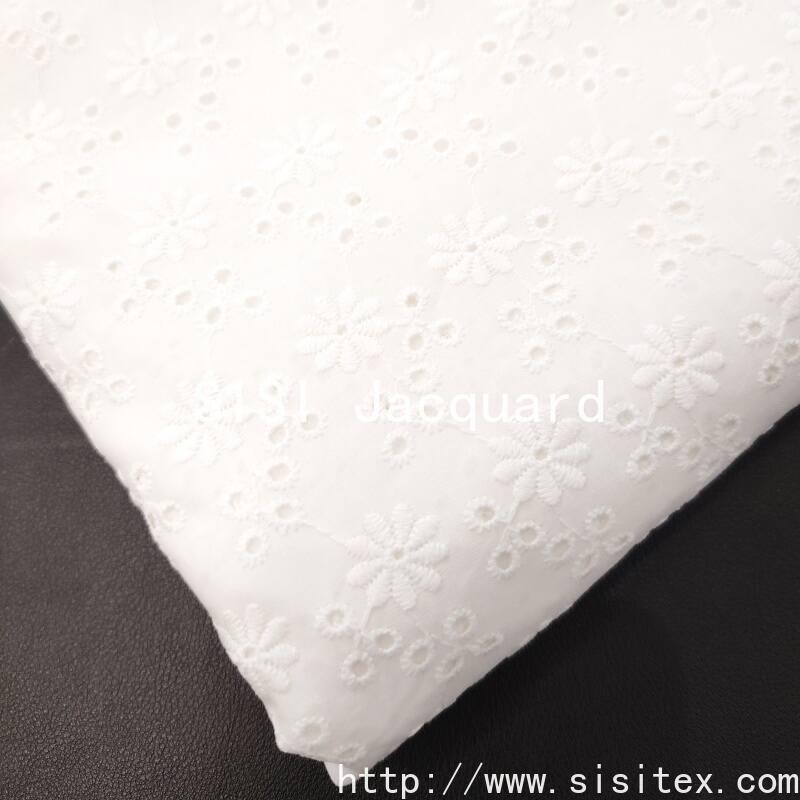 This fabric is made of 100% combed cotton (JC60×JC60) and is woven through a meticulous镂空 embroidery technique, creating a brilliant and cheerful sunflower pattern. The embroidery holes are fine and orderly, the flower shape is full and lively, forming a transparent and three-dimensional texture, as if sunlight is penetrating the petals. The fabric is soft and comfortable to the skin, with cotton fibers providing excellent breathability and comfort. The overall style is vibrant and fresh, full of natural vitality and the warmth of craftsmanship. It is suitable for creating summer dresses, shirts, and bright home accessories.